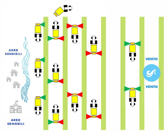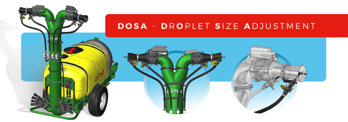 DOSA consente di contenere l'effetto deriva producendo all'occorrenza gocce di maggiori dimensioni senza modificare il volume e la velocità dell'aria erogata, né i litri per ettaro di liquido distribuito; mantenendo invariati tutti i capisaldi del basso volume garanzia di efficacia delle macchine irroratrici Cima.